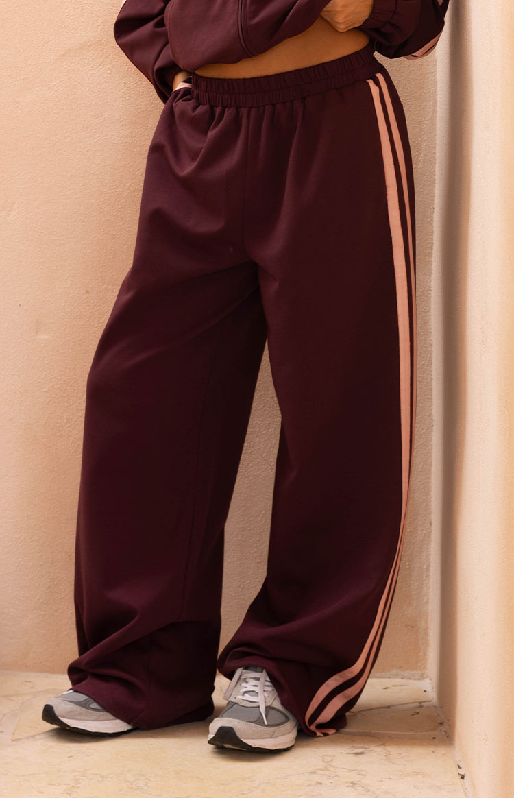 Comfort meets cool in the Kosie Burgundy/Pink Stripe Track Pants. Featuring a relaxed loose fit and bold contrast stripes, these fully lined pants are perfect for off-duty days. Pair with the matching track jacket and sneakers for a statement street style look.